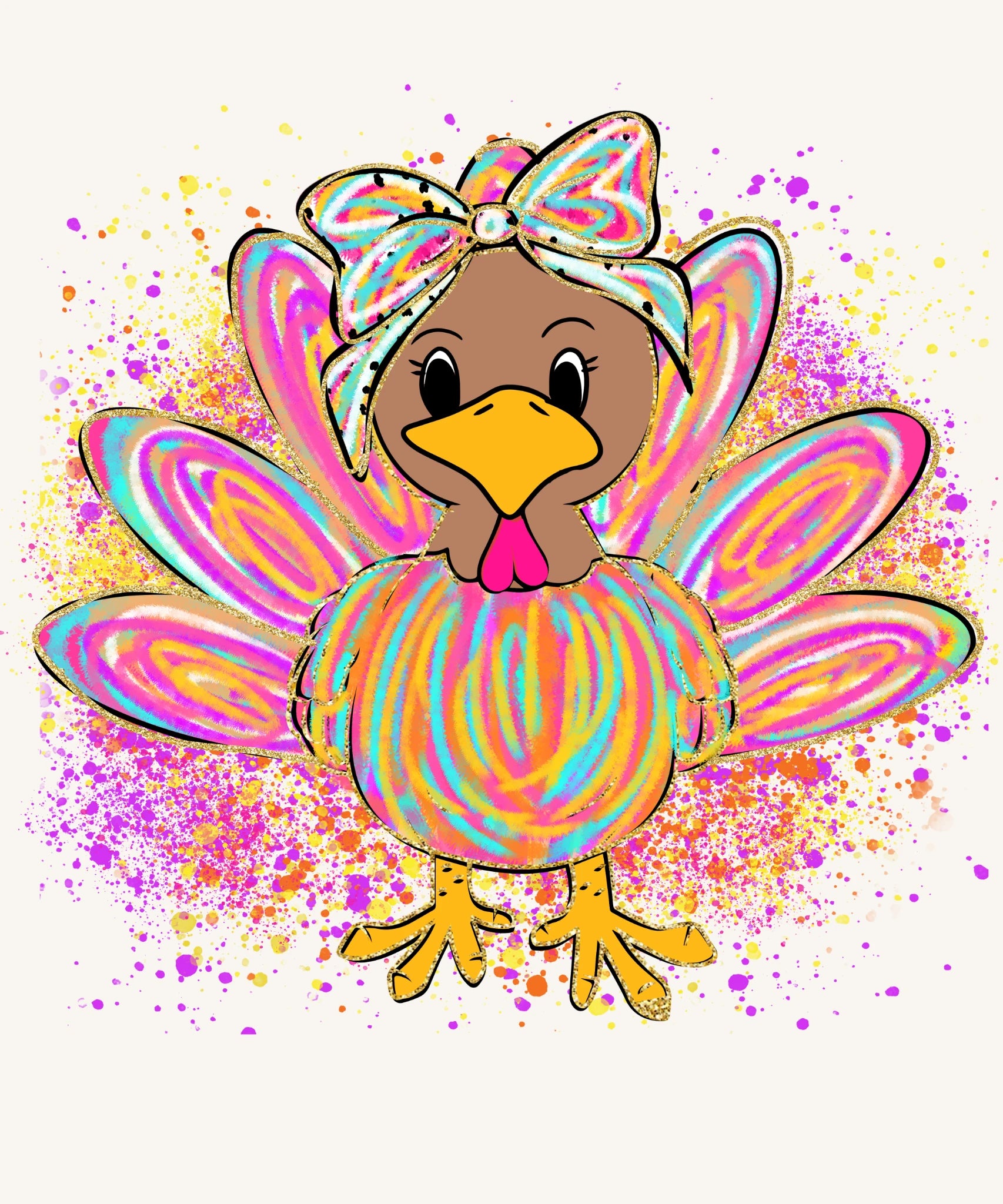 Featuring a cute turkey dressed in pastel rainbow tones with a glittery bow and paint-splatter background, this design brings a perfect mix of fun, fashion, and holiday cheer.