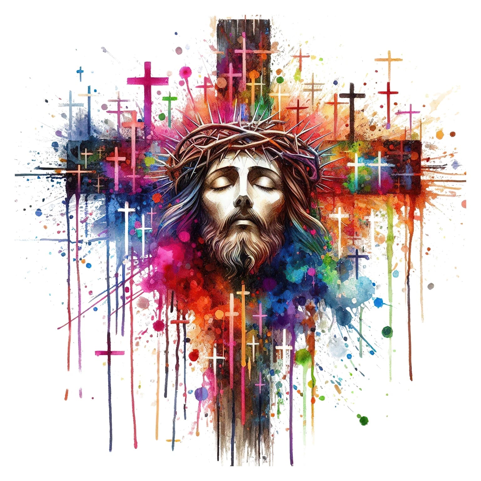 Express faith and devotion with this powerful Jesus Crown of Thorns design. Featuring the face of Jesus with a crown of thorns, surrounded by multiple crosses and vibrant watercolor splashes, this artwork blends spirituality with modern artistic style.