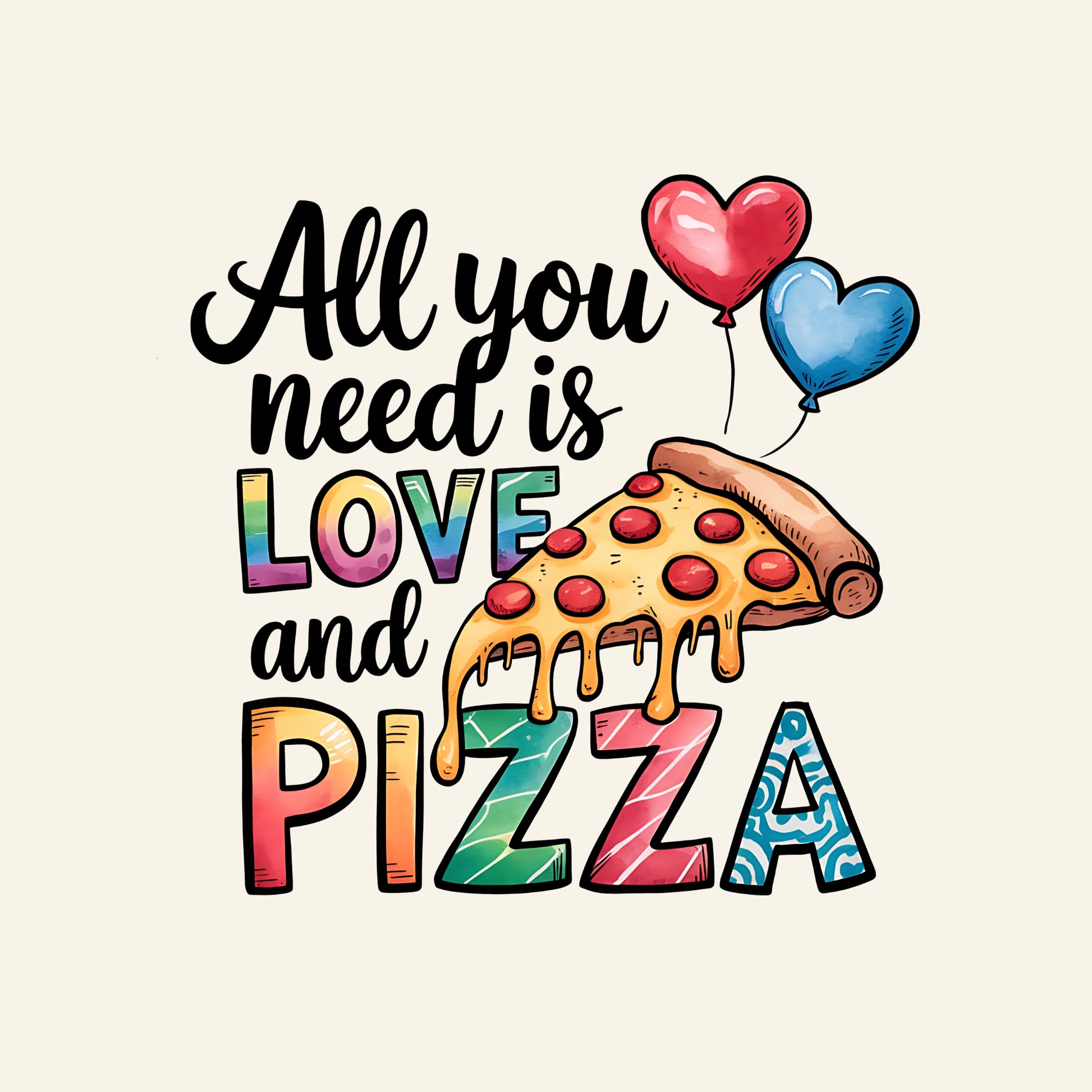 - 🌈 Bold rainbow-style “LOVE PIZZA” letters